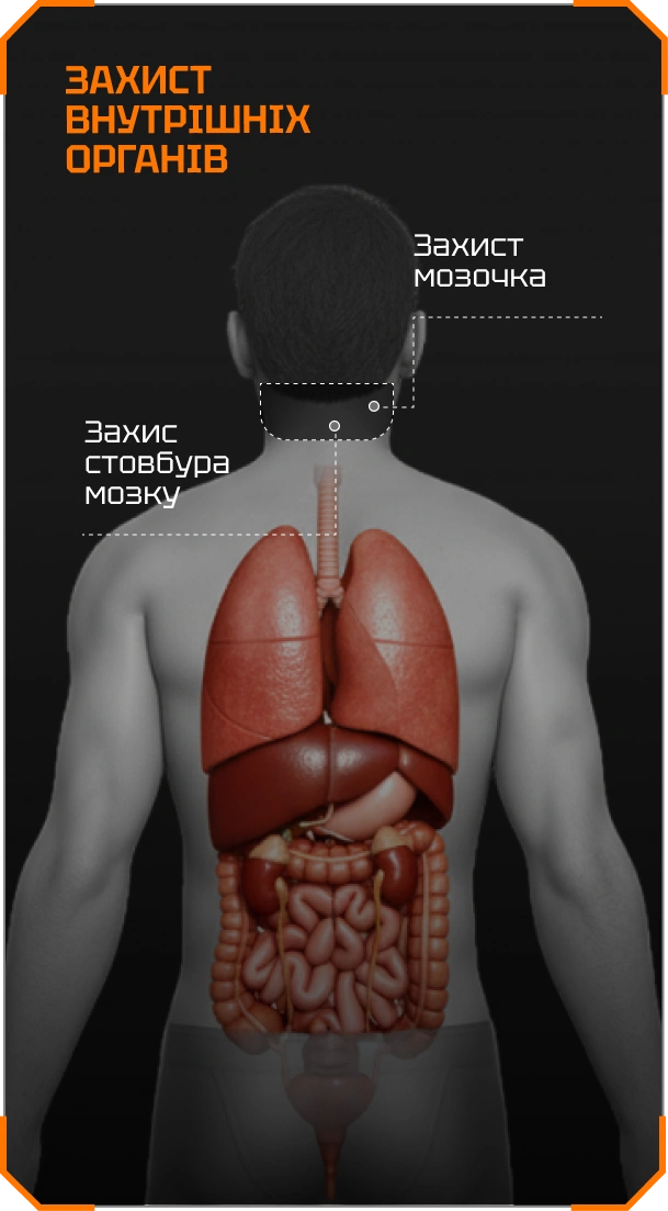 Потилиця — це критична зона на задній частині голови, де розташовані основні судини, шийний відділ хребта та ділянка, що впливає на роботу мозкового стовбура. М’який балістичний пакет для потилиці призначений для гасіння енергії уламків, шрапнелі, рикошетів та зменшення контузійного ефекту від ударної хвилі, що виникає при попаданні в шолом або бронезахист. Такий пакет пом’якшує передачу енергії на шию й череп, підвищує виживаність при комбінованих ураженнях і зберігає свободу рухів голови, сумісний із шоломами та системами розвантаження.